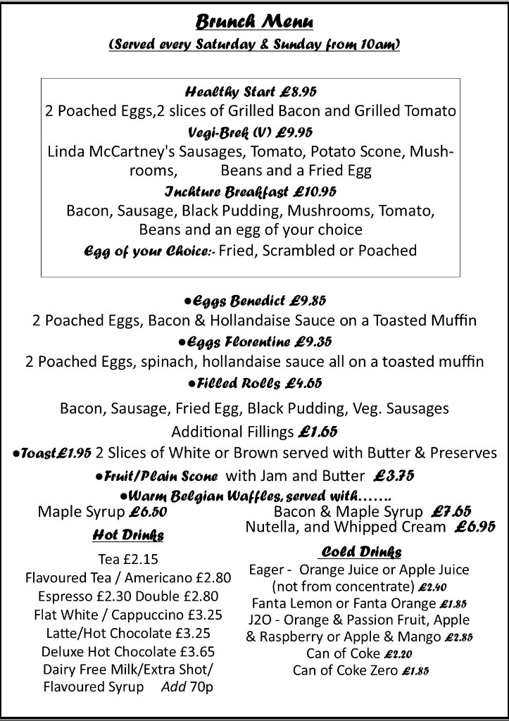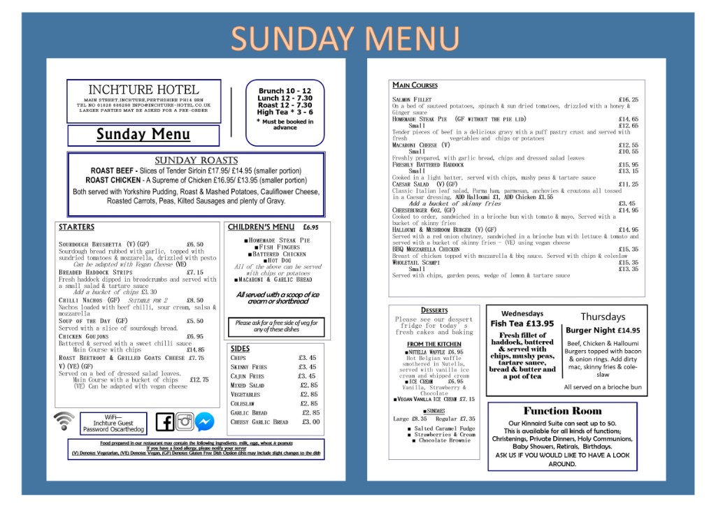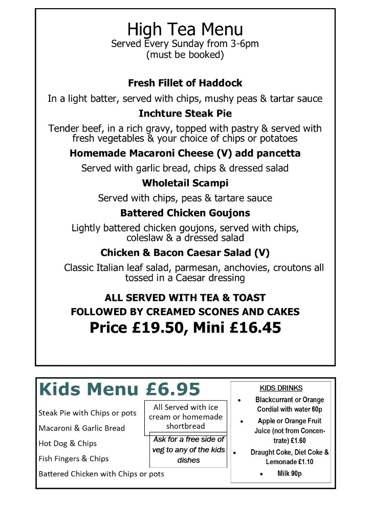 A traditional High Tea served every Sunday afternoon. Choose a main course, served with tea & toast, followed by creamed scones and cakes.